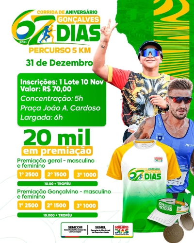No dia 31 de dezembro , acontece a Corrida de Aniversário de 67 anos de Gonçalves Dias , com percurso de 5 km e R$ 20 mil em premiação!