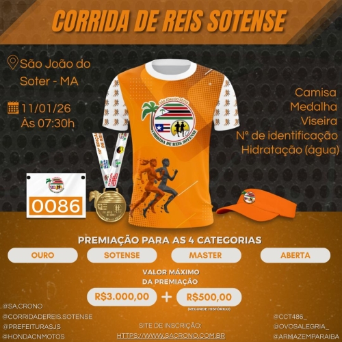 A 10ª Corrida de Rua do município de São João do Soter, denominada “Corrida de Reis Sotense”, será realizada no dia 11 de janeiro de 2026 – domingo às 7:30h da manhã, na cidade de São João do Soter – MA tendo como objetivo também a confraternização entre os participantes da corrida e a comunidade sotense.