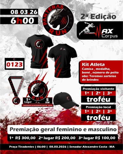 A corrida que marcou a cidade está de volta e ainda maior! Prepare-se para viver um momento de superação, união e pura energia. A segunda edição da PANTERAS RUN chega no dia 08 de Março de 2026, trazendo de volta toda a emoção que tomou conta de Senador Alexandre Costa no ano passado — agora com ainda mais participantes, mais estrutura e um clima esportivo que contagia toda a região.