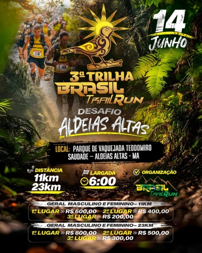 A 3ª edição da Brasil Trail Run chega ainda mais forte e cheia de emoção na acolhedora cidade de Aldeias Altas – MA, reunindo um verdadeiro grupo de apaixonados por aventura e superação. O evento contará com dois percursos desafiadores, de 11km e 23km, cuidadosamente planejados para testar limites e, ao mesmo tempo, proporcionar uma imersão completa na natureza.